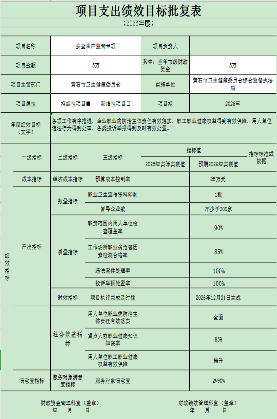 3)安全生产监管项目。预算经费5万元。2026年度项目绩效总目标是:各项工作有序推进,企业职业病防治主体责任有效落实,职工职业健康权益得到有效保障,用人单位违法行为得到处理,各类投诉举报得到及时有效处置。产出指标:督导企业数不少于200家,职责范围内用人单位检查覆盖率达90%,违法案件处理率和投诉举报处置率达100%。效益指标:用人单位职业病防治主体责任有效落实全面落实。满意度指标:服务对象满意度达100%。
