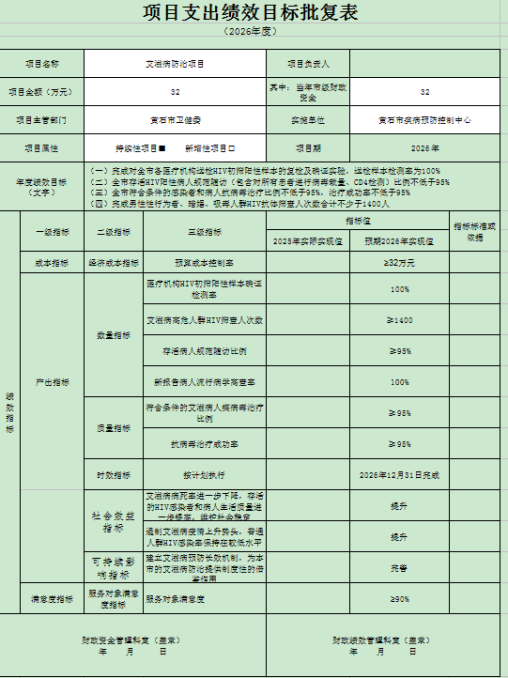 1)艾滋病防治项目。预算经费 32万元。2026年度项目绩效总目标是:一是完成对全市各医疗机构送检HIV初筛阳性样本的复检及确证实验,送检样本检测率为100%;二是全市存活HIV阳性病人规范随访(包含对所有患者进行病毒载量、CD4检测)比例不低于95%;三是全市符合条件的感染者和病人抗病毒治疗比例不低于95%,治疗成功率不低于95%;四是完成男性性行为者、暗娼、吸毒人群HIV抗体筛查人次数合计不少于1400人。产出指标:医疗机构HIV抗体初筛阳性样本确证检测率100%、艾滋病高危人群HIV筛查人次数1440人次、存活病人病载、cd4随访检测率95%以上、艾滋病报告质量达100%、符合条件的艾滋病人搞病毒治疗比例95%以上、抗病毒治疗成功率达95%。效益指标:降低艾滋病疫情的发生和早发现病人,减少艾滋病人医疗费用支出。