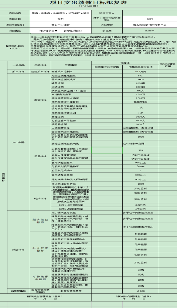 2)慢病、传染病、免疫规划、地方病防治项目。预算经费72万元。2026年度项目绩效总目标是:慢病:一是全市死因监测粗死亡率超过6%,人均期望寿命及重大慢病过早死亡率达到考核目标。二是规范肿瘤登记、心脑血管事件报告、慢阻肺报告。肿瘤发病率不低于180/10万,死亡率不低于100/10万;病理组织学诊断所占比例在40%到95%之间;死亡与发病数之比(M/I)在0.4到0.95之间;发病率和死亡率年度变化低于10%。心脑血管事件监测二级以上医疗机构报告覆盖率达到100%。三是实施全民健康生活方式,各县(市)区全民健康生活方式月宣传活动覆盖率达到100%。四是规范全市老年人、高血压、糖尿病健康管理。传染病:传染病监测率100%,传染病疫情及突发公共卫生事件调查处置率100%。免疫规划:国家免疫规划疫苗接种率≥90%;AFP报告发病率达到1/10万;麻疹报告排除发病率达到2/10万;入托入学新生预防接种证查验率≥95%;加强疫苗可预防疾病监测,进一步降低疫苗可预防传染病的发病率。地方病完成年度工作目标,持续保持消除状态。效益指标:降低相关疾病直接负担(减少可预防针对疾病诊断、治疗;低相关疾病间接负担(陪护、劳动力损失、相关社会负担)等。满意度指标:达到相关传染病防控工作指标要求。