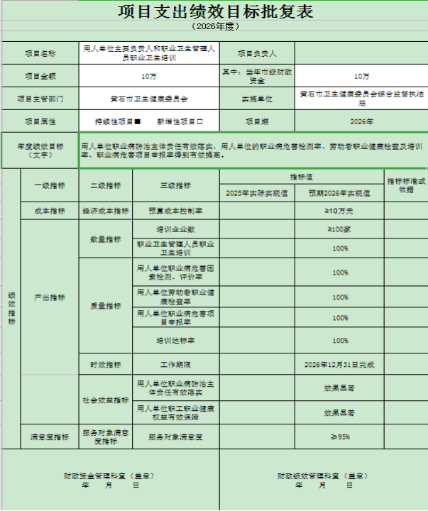 6)用人单位主要负责人和职业卫生管理人员职业卫生培训项目。预算经费10万元。2026年度项目绩效总目标是:用人单位职业病防治主体责任有效落实,用人单位的职业病危害检测率、劳动者职业健康检查及培训率、职业病危害项目申报率得到有效提高。产出指标:职业卫生管理人员职业卫生培训达100%,用人单位职业病危害因素检测、评价率和用人单位劳动者职业健康检查率申报率100%。效益指标:用人单位职业病防治主体责任有效落实、用人单位职工职业健康权益有效保障。满意度指标:服务对象满意度95%以上。