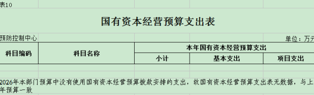 2)2026年疾控中心预算中没有使用国有资本经营预算安排的支出,故国有资本经营预算支出表无数据,与上年一致。
