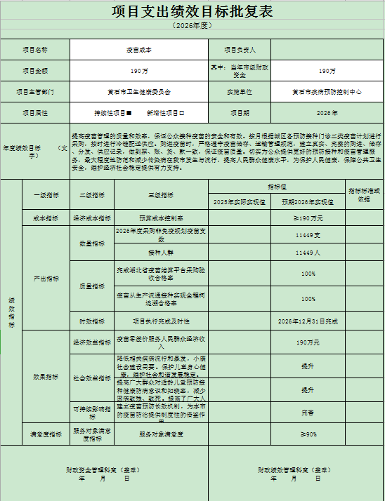 产出指标:2026年度非免疫规划疫苗采购采购数量15.63万支,年度内疫苗采购合格率达100%,湖北省疫苗结算平台采购和支付100%。