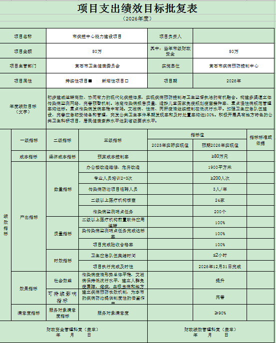 5)疾控能力建设项目。预算经费80万元。2026年度项目绩效总目标是:初步建成运转高效、协同有力的现代化疾控体系,实现疾病预防控制与卫生监督执法的有机融合。构建多渠道立体传染病监测网络,完善预警机制。法定传染病报告质量、适龄儿童国家免疫规划疫苗接种率、重点慢性病规范管理率均达标。重点传染病发病率稳中有降。艾滋病、性病、丙肝疫情继续控制在低流行水平。加强卫生应急队伍建设,完善应急物资储备和管理,突发公共卫生事件早期发现率和及时处置率均达100%。积极开展具有地方特色的公共卫生科研项目,居民健康素养水平达到省级要求水平。产出指标:传染病监测哨点任务完成达标率100%,二级以上医疗机构前置软件应用运转100%。效益指标:传染病疫情形势总体平稳,艾滋病保持低流行水平,建立人群免疫屏障,疟疾、血吸虫病和地方病消除成果持续巩固,最大程度地防范和减少突发急性传染病在我市发生与流行,不断增强人民群众的获得感、幸福感、安全感。满意度指标:服务对象满意度达90%以上。