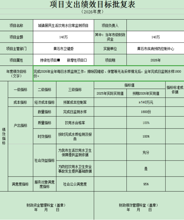 (7)2026年度项目绩效总目标是:完成2026年全年每日水质监测工作,排除因维修、保管等无法采样情况后,全年完成日监测水样1800份。